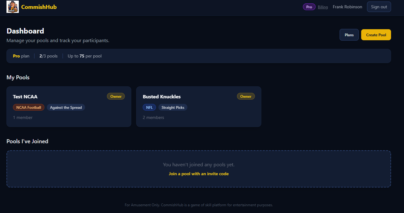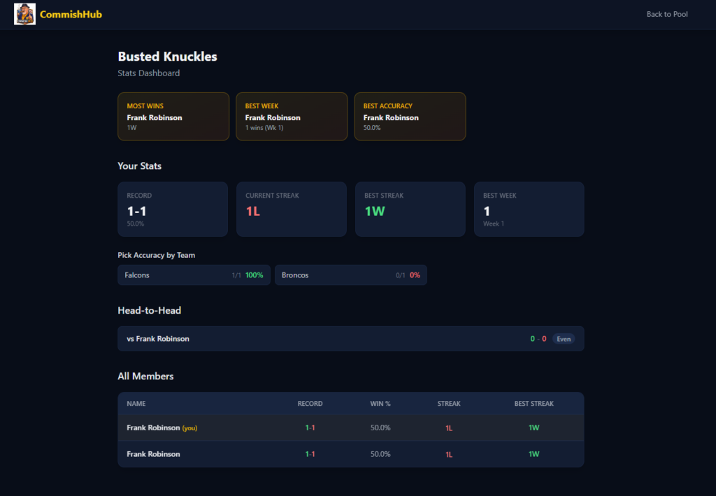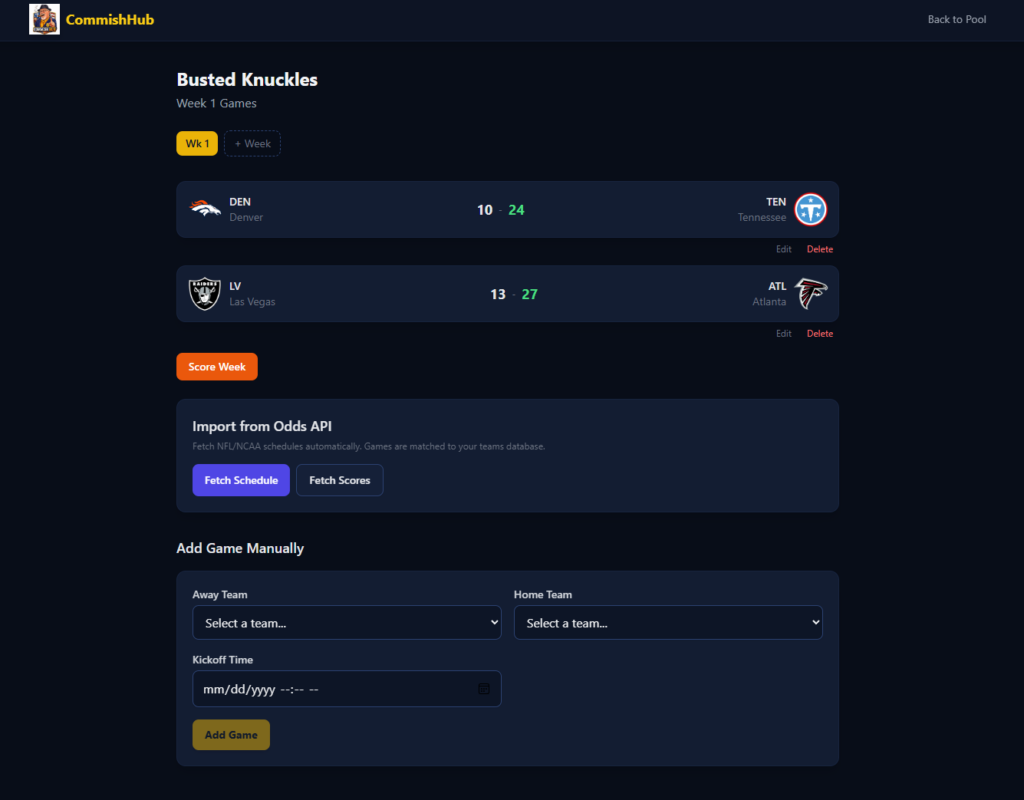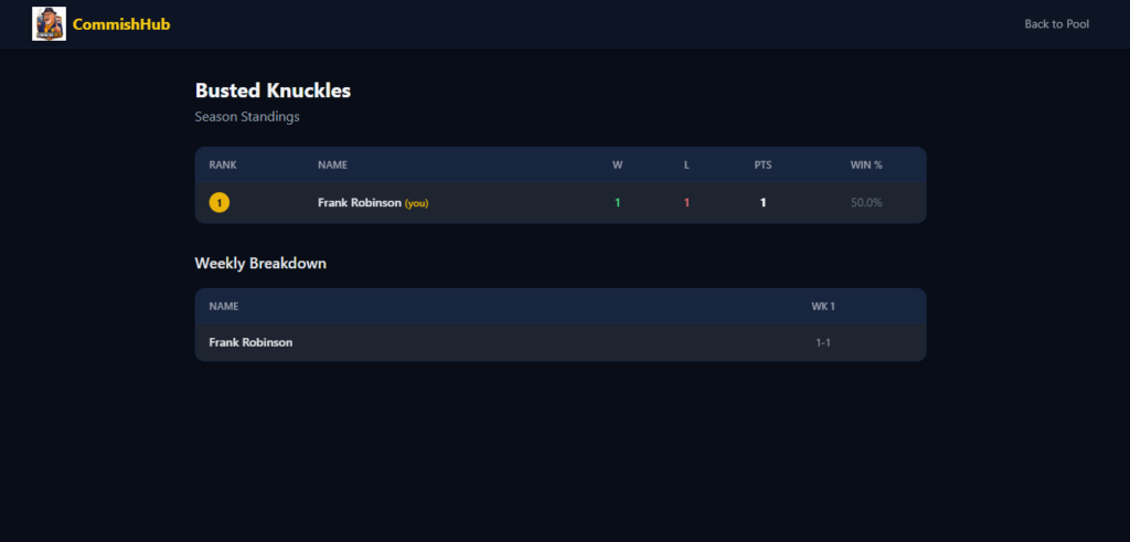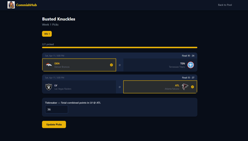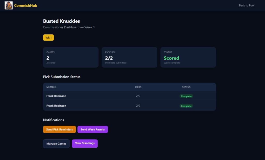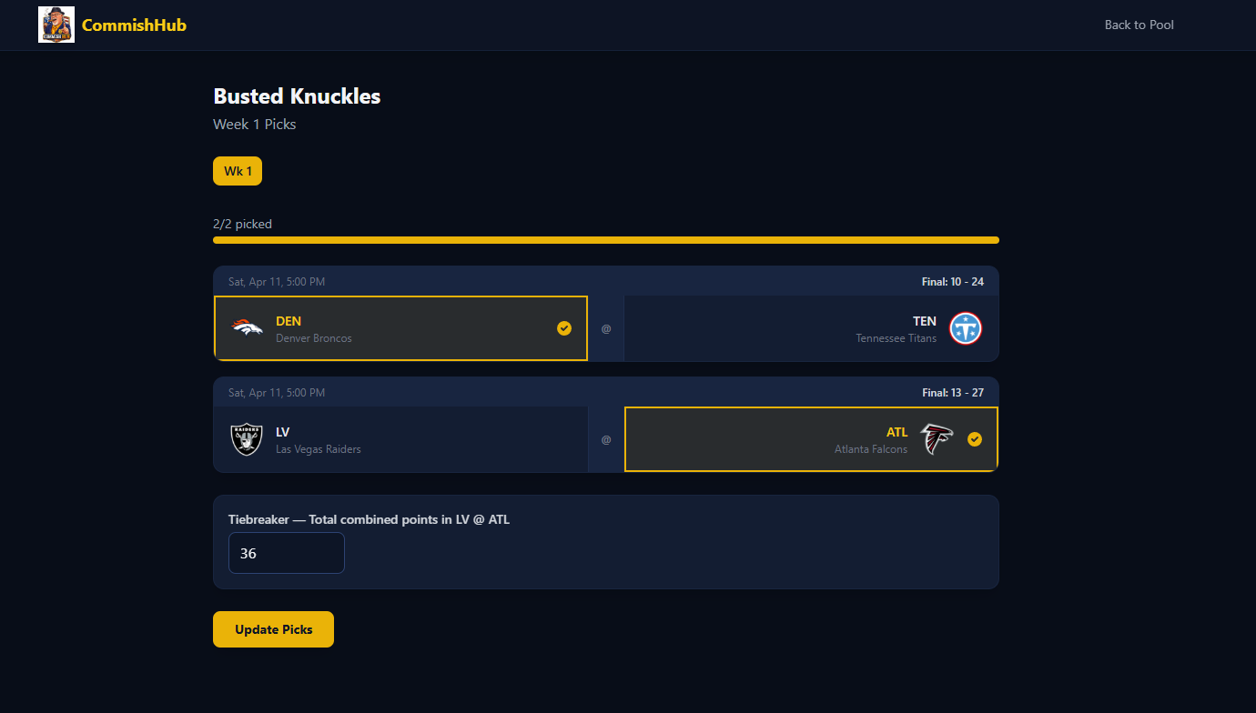 CommishHub is actively in development. The core pick submission flow, pool management, and standings engine are the primary focus right now. This one’s being built to actually use, I’ve got people lined up who are tired of the spreadsheet life just like I was.
