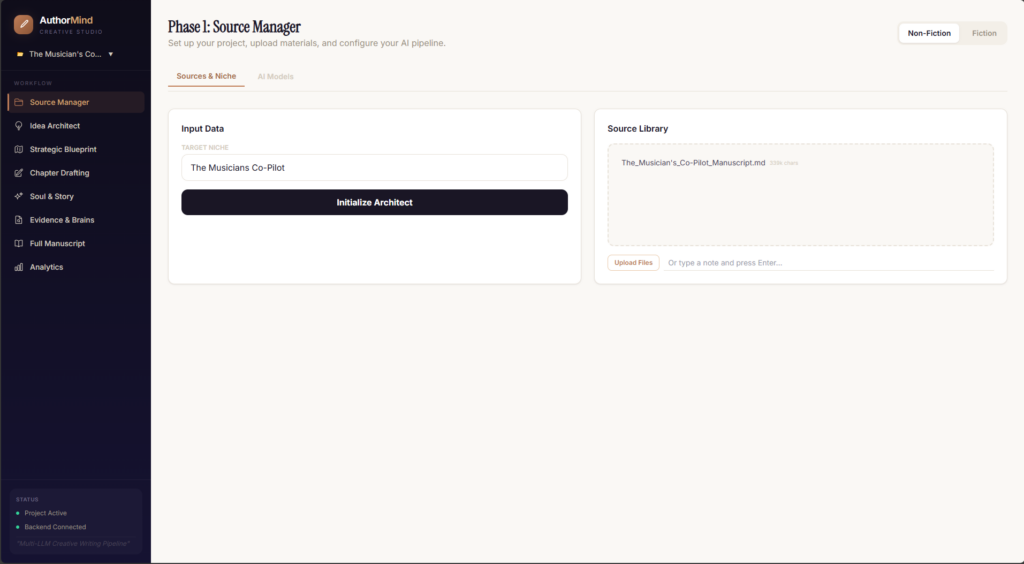 AuthorMind AI is a React 19 + Vite + TypeScript single-page app built from Google AI Studio and transformed into a local run app with Claude Code, currently using only Gemini 3 Pro for non-fiction book writing across 7 phases (Setup → Architect → Blueprint → Drafting → Narrative → Evidence → Manuscript).